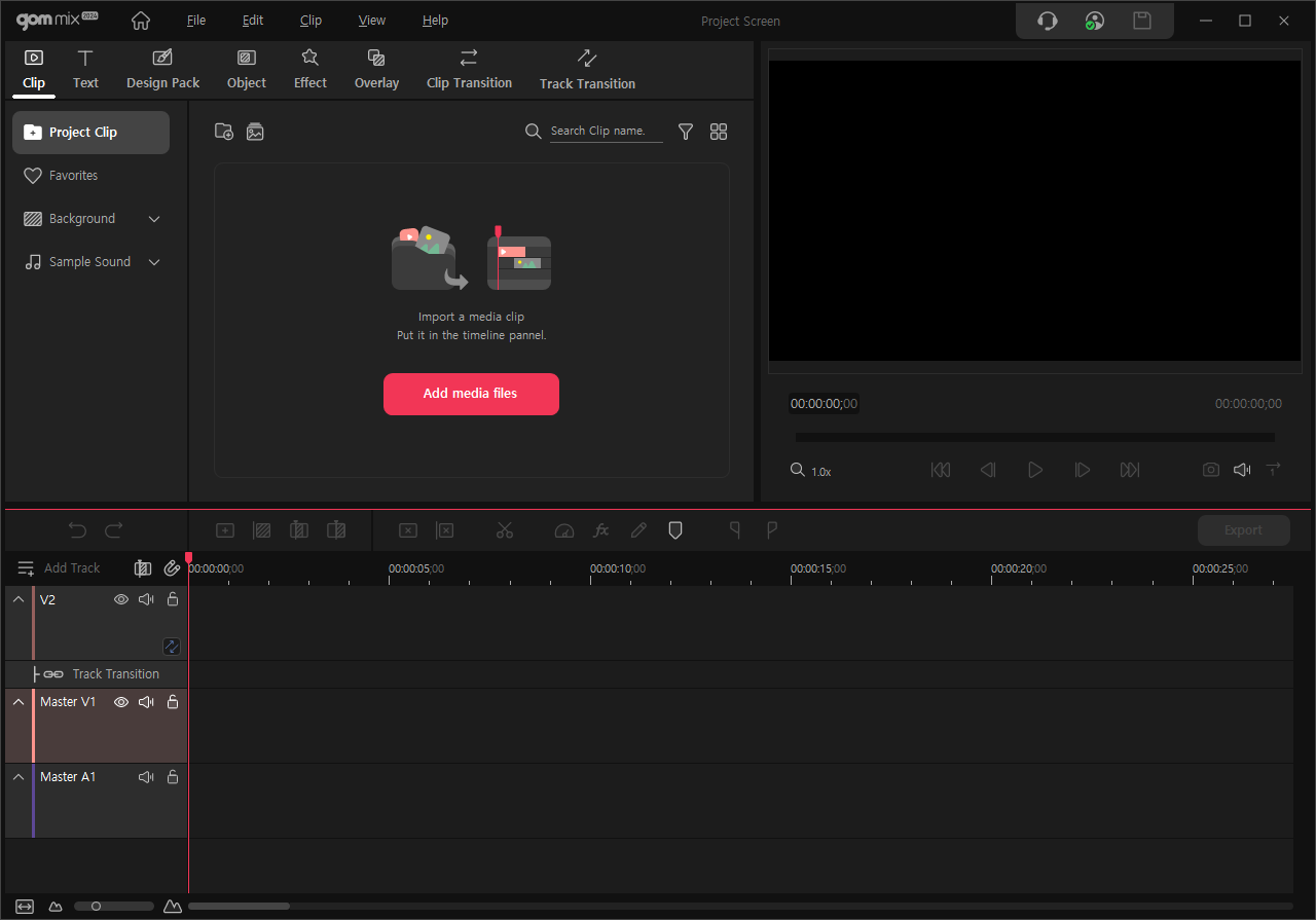 It is composed of Clip, Text, Object, Effect, Overlay, Clip Transition and Track Transition tabs.