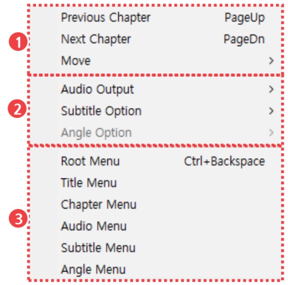 Able to select audio, subtitles, angles of an DVD video. If you select each menu, the corresponding item for selecting will be displayed.