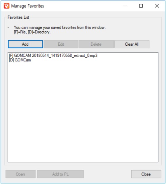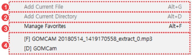 | Manage Favorites | The Manage Favorites window will appear. You can add to, delete from, or edit video files or folder in Favorites. |