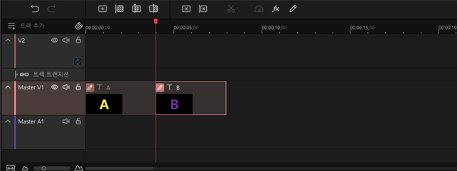 클립 트랜지션 탭은 왼쪽 클립과 오른쪽 클립을 나란히 한 후 각 트랙의 영상을 혼합하여 결과 영상을 만듭니다.