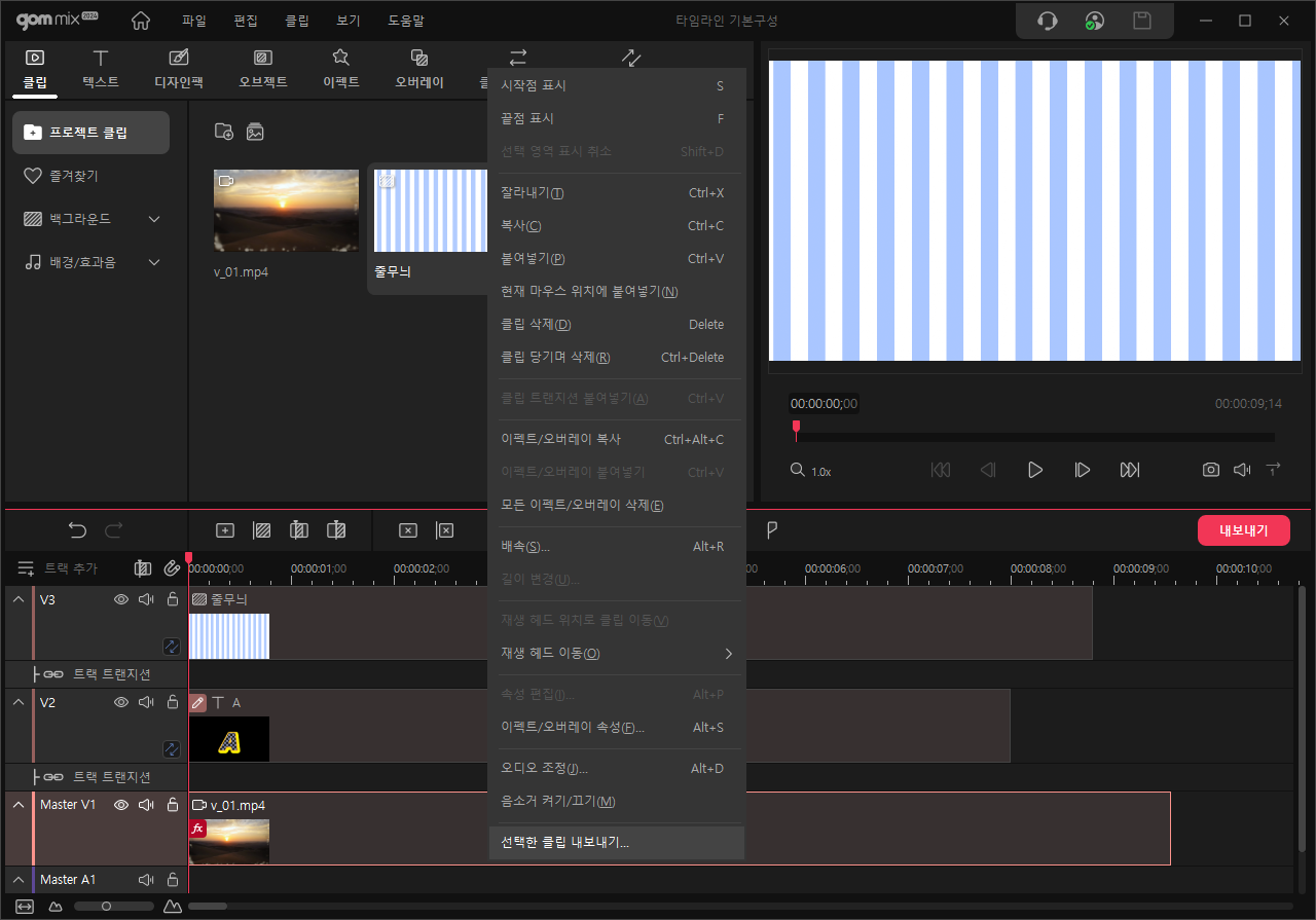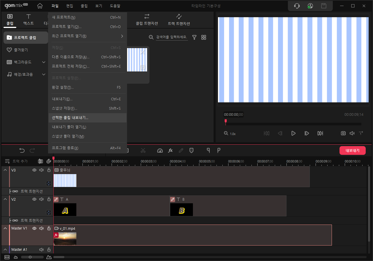 타임라인에 생성 후 편집한 일부 클립만을 선택해서 내보내기 할 수 있습니다.
