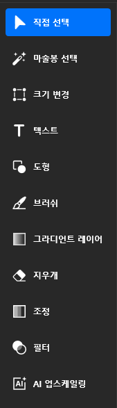 이미지를 편집하기 위해 쓰이는 도구를 선택하고 활용할 수 있는 편집 도구 메뉴 영역입니다.