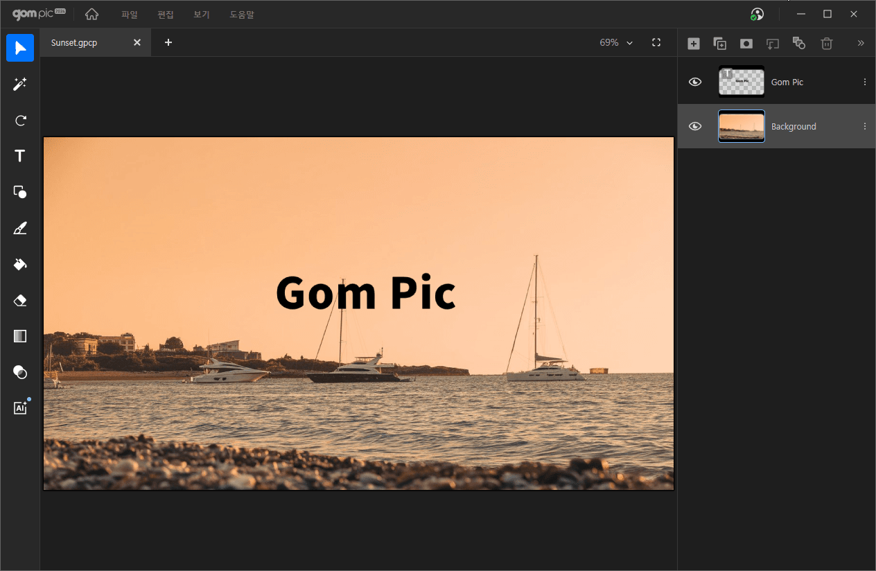 선택 도구, 자르기, 텍스트, 도형, 브러쉬, 페인트 통, 그라디언트 레이어, 지우개, 조정, 필터, AI업스케일링으로 구성되어 있으며, 각 툴을 선택하면 설정 창이 나타납니다.