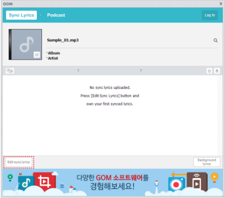 You must be logged-in using your linked SNS account or the GOM product ID/PW to register synced lyrics.