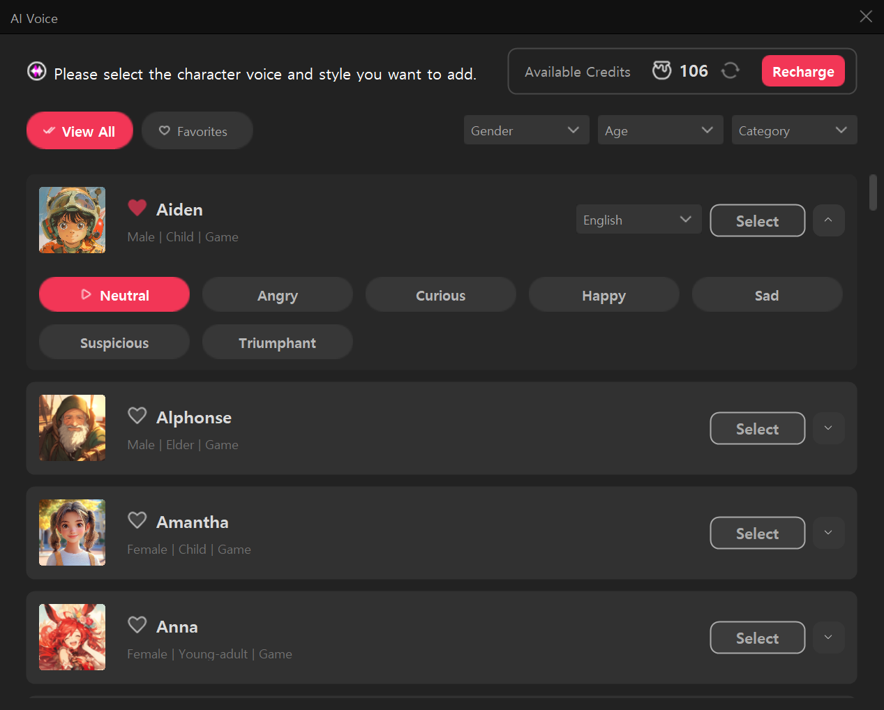 Check out the list of characters provided by AI Voice. You can search by category to find a character that matches your desired gender, age, or topic.