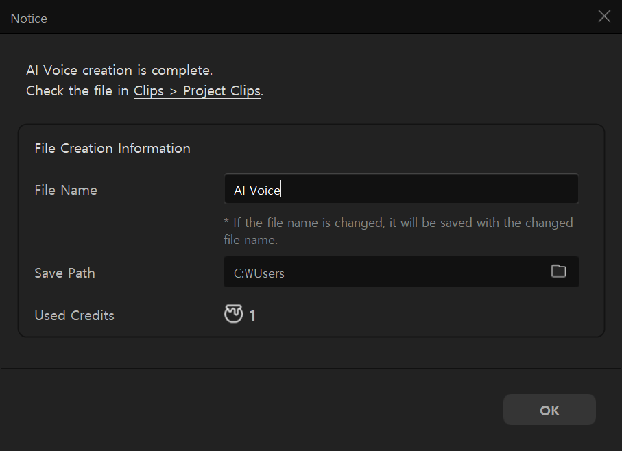 Credits will be used based on the text entered during AI Voice generation. After generating is complete, you can name the clip file and save.