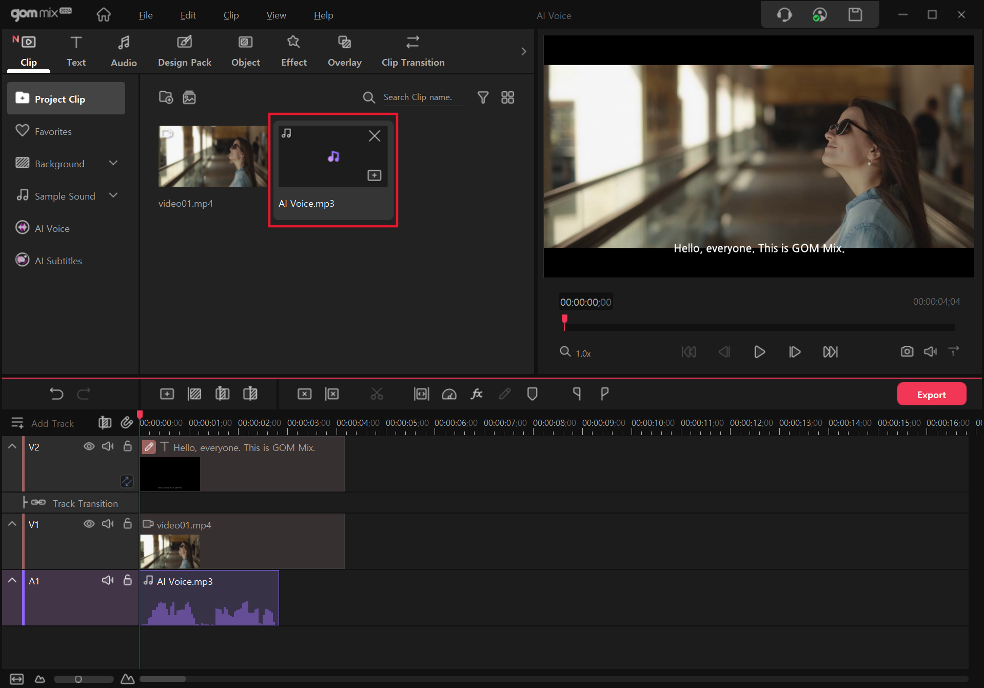 The generated clip file can be viewed in the Project Clips window. Add the generated voice clip to the desired timeline.