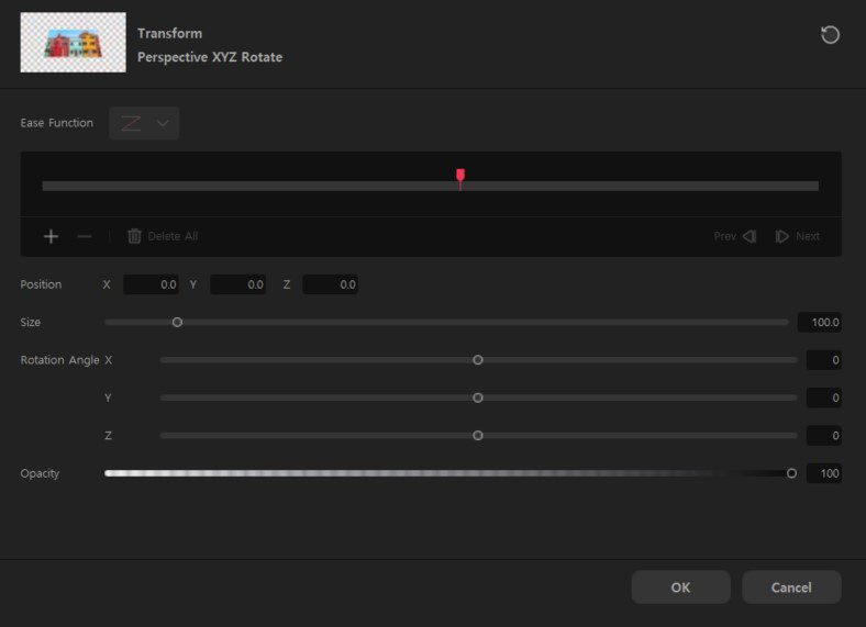 [Keyframe Control] with the playback head at the top is displayed only in the effect where the keyframe can be applied. Change the size, position, and other variables then press the [OK] button to apply an effect to the selected clip.