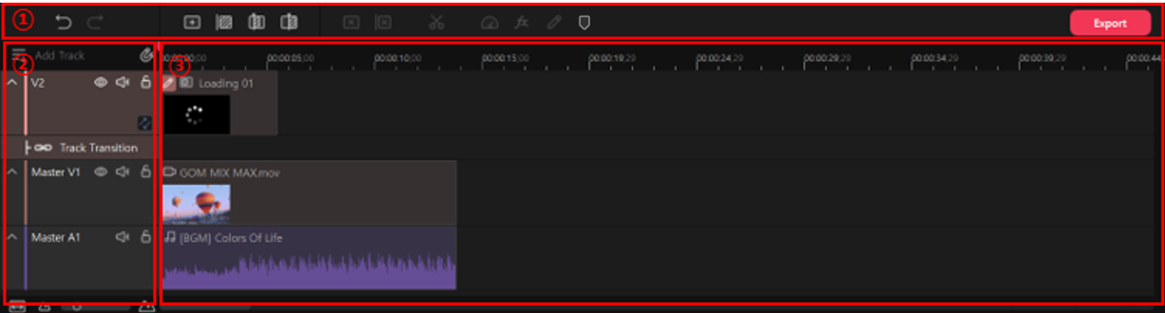 This panel is composed of timeline toolbar, track control area, and timeline work panel.