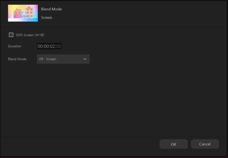 “Screen” effect property setting Shifts Screen (A↔B) Check it to change the reference clip for blending the top and bottom clips. Even if you change the reference clip for some blend effects, the same effects will remain. Duration It is the time duration for blending to be applied.