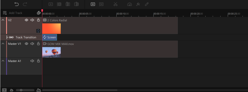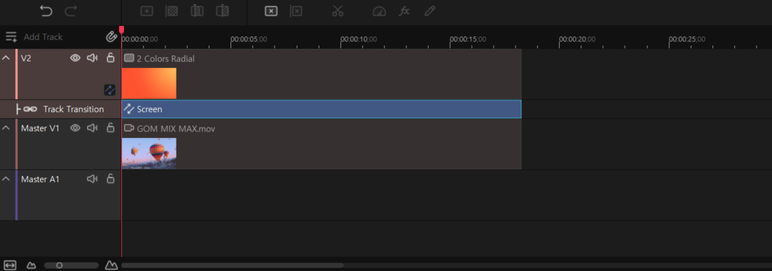 Enter the “Screen” Property Setting to see the “Track transition control clip” between the transition tracks or video tracks of the timeline panel.