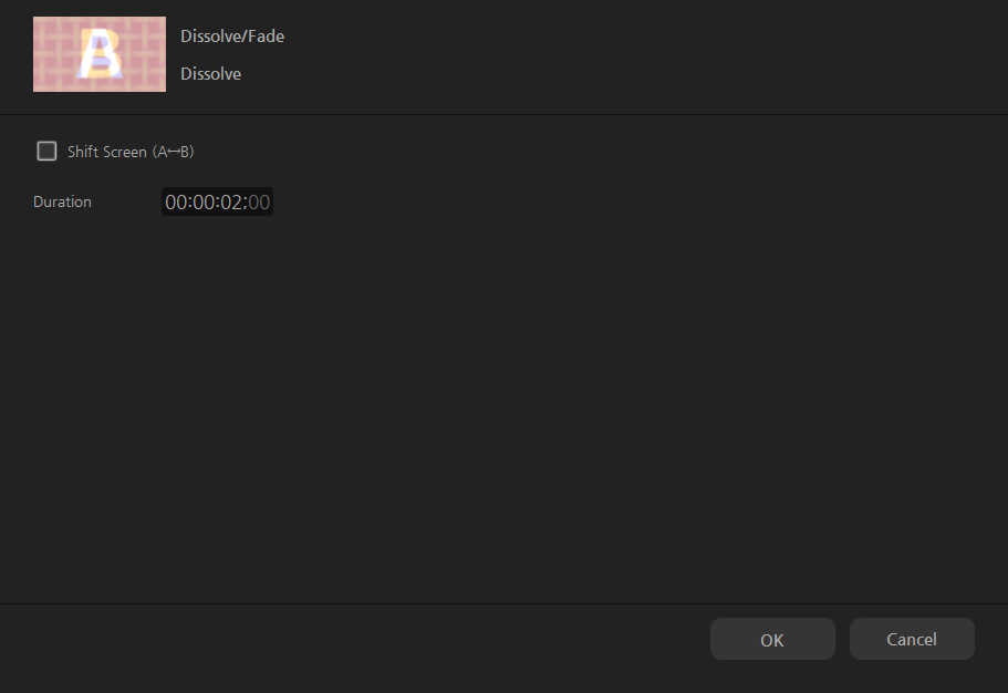 “Dissolve” effect dialog box Shift Screen (A↔B) Check it to let the track transition proceed from the top clip to the bottom clip. Duration It is the lasting duration of track transition.