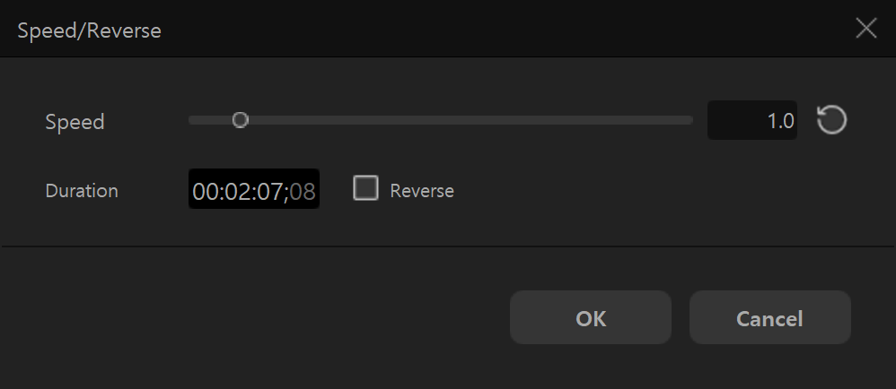 [Speed/Reverse] Settings window allows you to change the clip length and convert it to reverse playback. Applying a faster speed will shorten the clip's duration, while applying a slower speed will lengthen it.