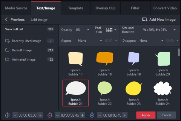 Click Apply. The selected image is added to the listing pane and the Text track in the timeline.