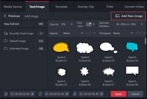 You can add and edit images to the video or background image. In the Text/Image tab, click Add Image to open the Add Image panel.