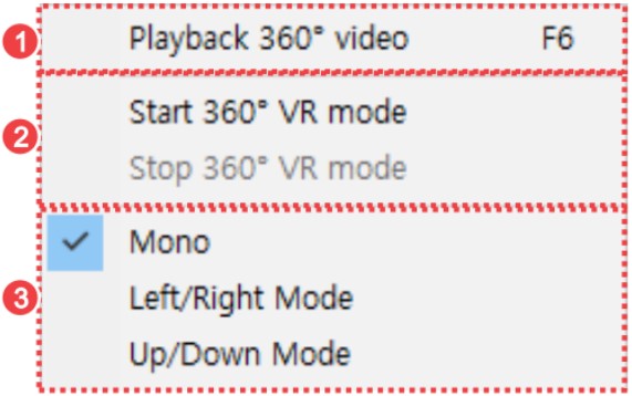 | Playback 360° VR mode | Start VR mode. If you start VR mode, it will turn into 360° VR Mode stop menu, and if you select it again, the VR mode will stop. |