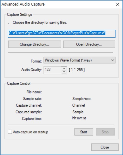 - Format: Set the format of the audio file to be saved *GOM player supports .wav format and *.ogg format.