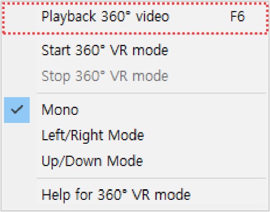 Able to play videos produced in a VR (Virtual Reality) format. If you select the Playback 360° video in the basic menu, you can import and play VR videos in the pop-up menu displayed.