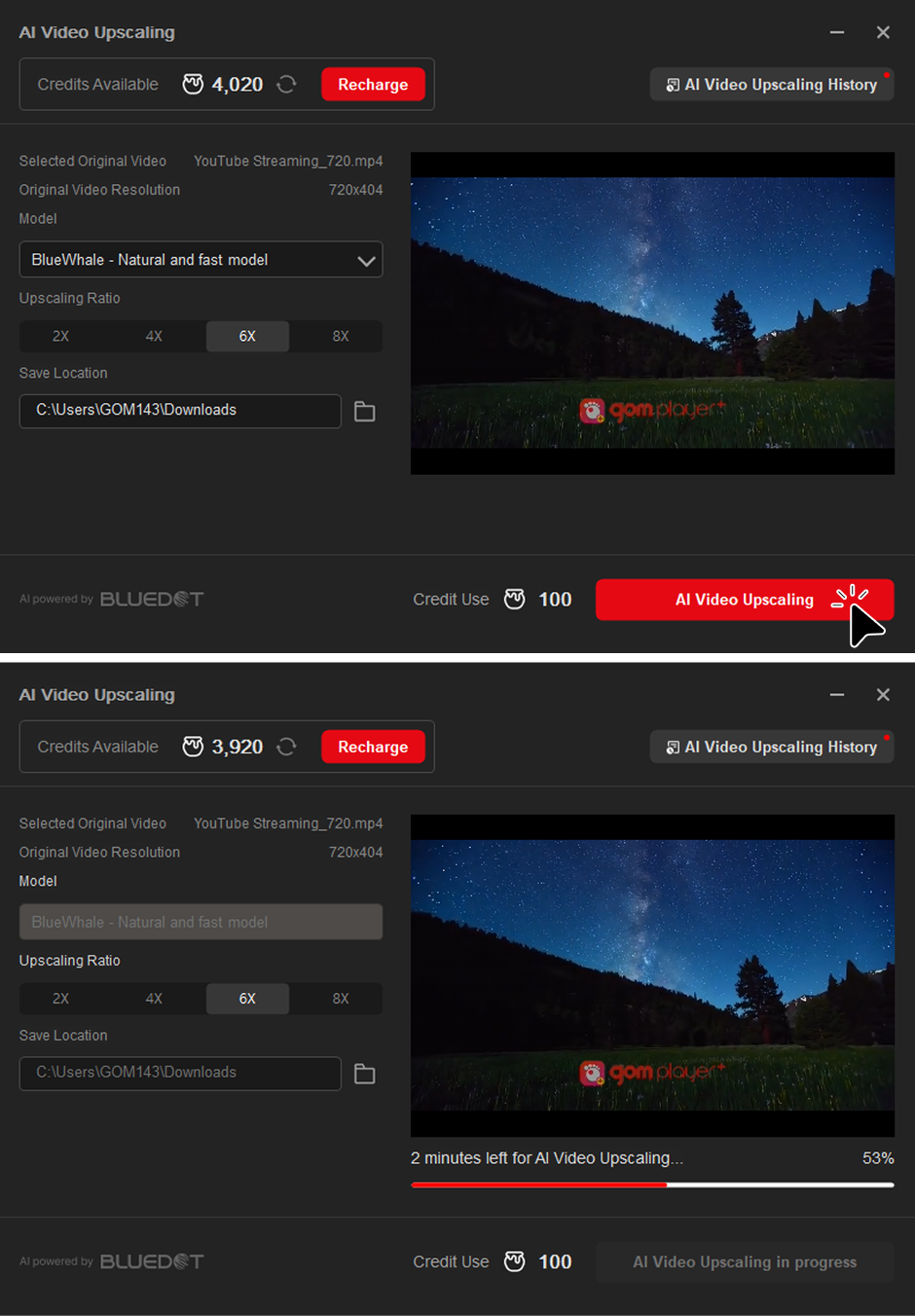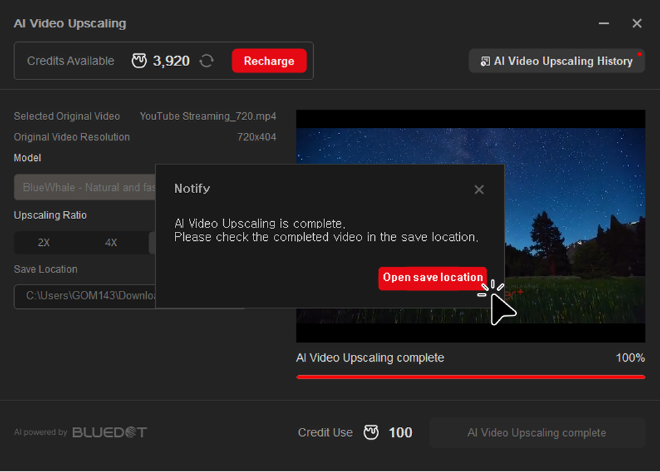 - 2) Clicking the "Open Save Location" button will open the folder where the upscaled video is saved.