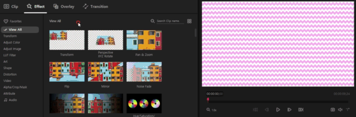 In the "Transform " category of the effects tab, choose the “Transform ” effect. And a setting window will appear for the effect. |