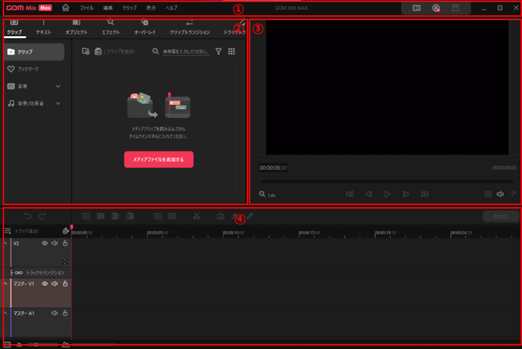 GOM Mix MAXプロジェクト画面は大きくメニューバーパネル、ソース・エフェクトパネル、
