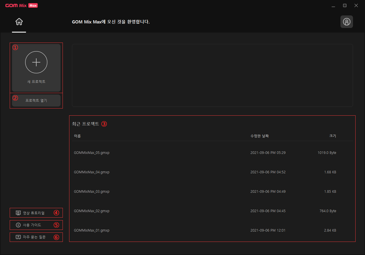 최근에 작업한 프로젝트를 모아서 보여주는 리스트입니다. 리스트 순서는 최근 수정한 날짜 순으로 나타나며, 클릭하면 해당 프로젝트의 실행 화면으로 넘어갑니다.