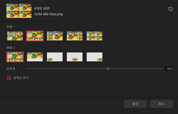 | 오프셋 | 선택된 프리셋에 잘라내는 화면의 좌우 또는 상하 위치를 조정합니다. | ||