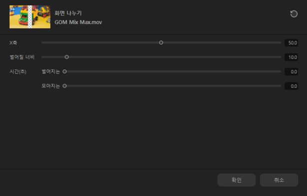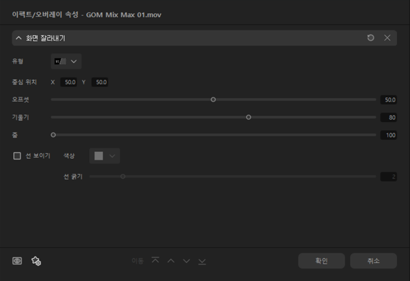 | X축 | 클립을 자르는 X축 위치입니다. 기본값은 가운데(50)이며 슬라이드 바를 움직여서 자를 위치를 잡습니다. | |