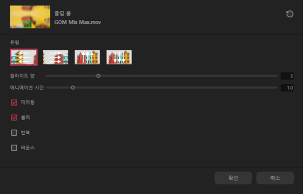 | 슬라이드 양 | 클립이 스크롤되는 양을 조정합니다. | |