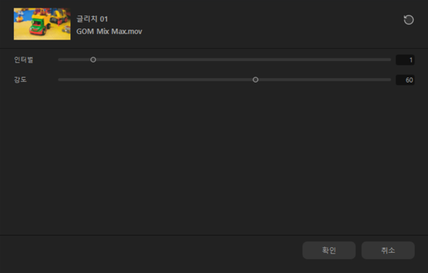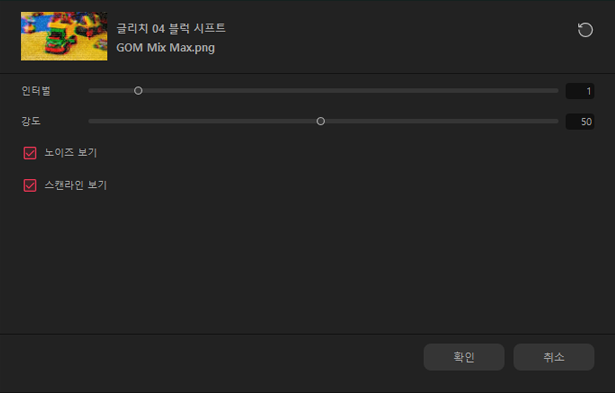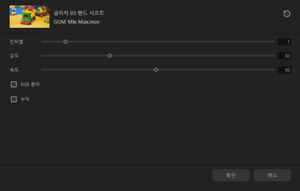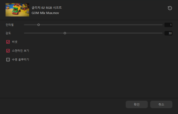 | 강도 | 글리치 효과의 세기입니다. 강도를 크게 하면 RGB로 분리 및 블록 노이즈가 커집니다. | |