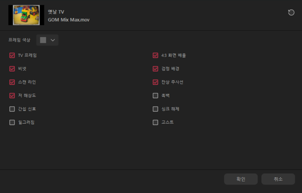 옛날 브라운관 TV 및 VHS 비디오 테이프 느낌을 주는 이펙트입니다. 체크 박스를 선택하거나 해제하여 다양하게 효과를 적용할 수 있습니다.