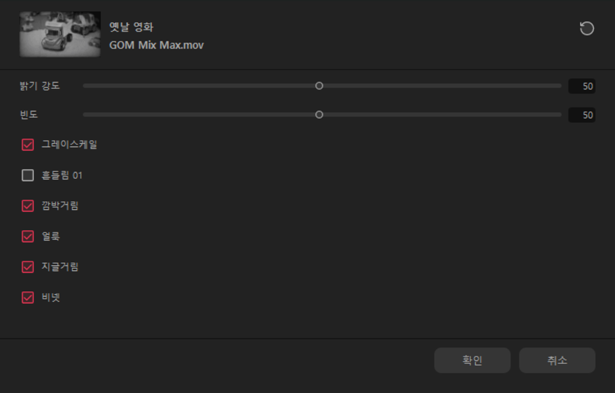 옛날 영화 느낌을 주는 이펙트입니다. 체크 박스를 선택하거나 해제하여 다양하게 효과를 적용할 수 있습니다.