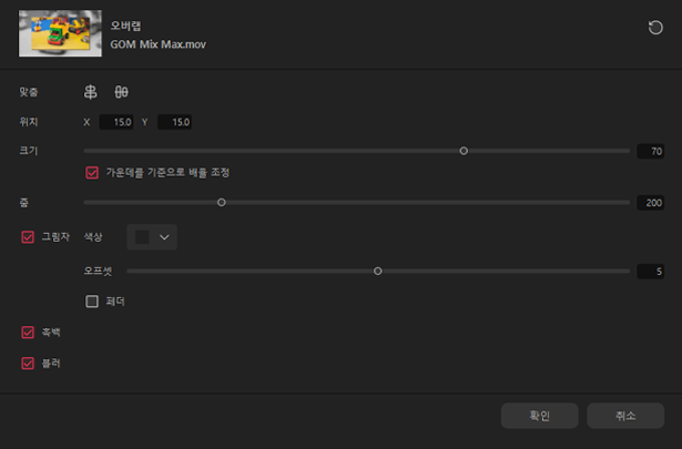 | 흑백 | 하단에 노출되는 클립을 흑백 처리합니다. | |