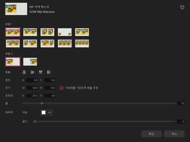 클립을 다른 클립 위에 작게 띄울 수 있는 PIP 기능을 마스크하여 적용합니다. PIP 기능을 적용했을 때의 마스크 위치와 크기, 오프셋을 조정합니다.