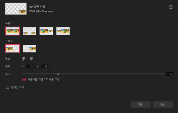클립을 다른 클립 위에 작게 띄울 수 있는 PIP 기능을 적용합니다. PIP 기능을 적용했을 때의 위치 및 크기를 조정합니다.