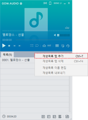 재생목록 창을 마우스 오른쪽 버튼으로 클릭합니다. 나타나는 팝업메뉴에서 [재생목록 탭 추가]를 클릭하면 새로운 목록이 생성됩니다.