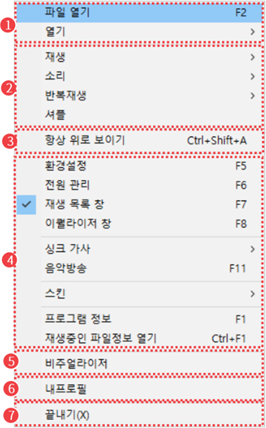 프로그램 기본 사용 환경을 설정하거나 재생 정보, 프로그램 정보, 파일 정보 등을 확인할 수 있습니다.