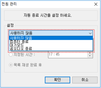 일정한 시간이 지난 후 음악이 저절로 꺼지거나, 음악을 듣다가 컴퓨터가 자동으로 종료되게 설정할 수 있습니다. 전원을 관리하는 방법은 아래와 같습니다.