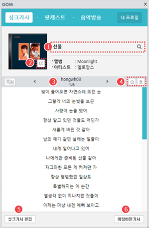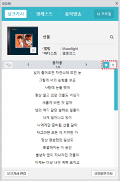 메인 영역에서 싱크 가사(F10)버튼을 클릭하면 재생 중인 음악의 싱크 가사를 볼 수 있습니다.