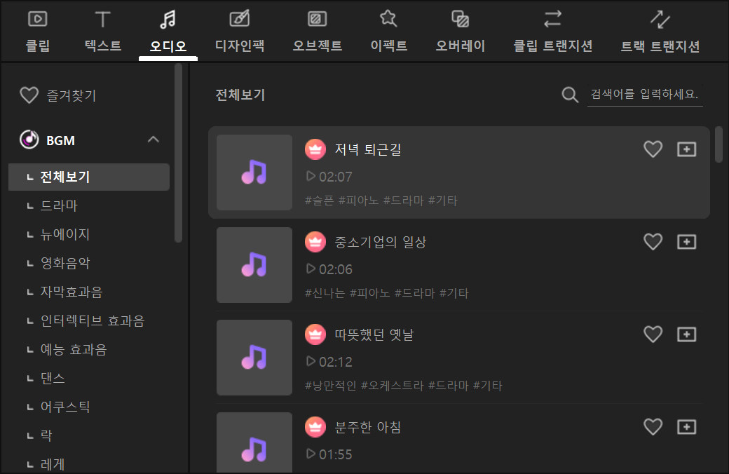 오디오탭을 클릭하면 좌측 패널에서 주제별 카테고리, 우측 패널에서 음원 리스트를 확인할 수 있습니다. 음원 리스트 우측에 있는 다운로드 버튼을 클릭하면 무제한 미리듣기가 가능합니다.