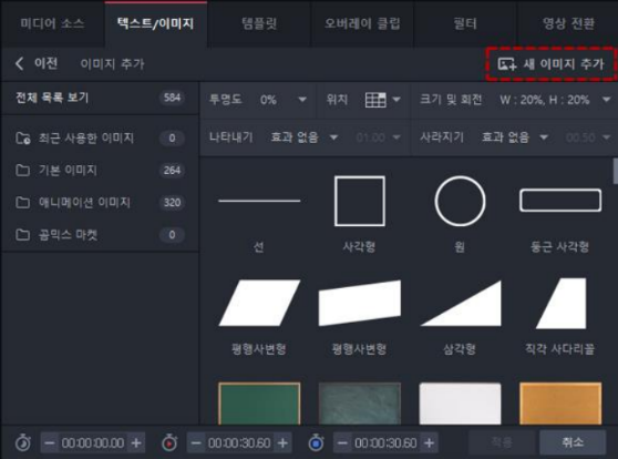동영상이나 배경 사진에 이미지를 직접 추가하고 꾸밀 수 있습니다. 텍스트/이미지 탭에서 이미지 추가를 클릭하면 이미지 추가 화면이 표시됩니다.