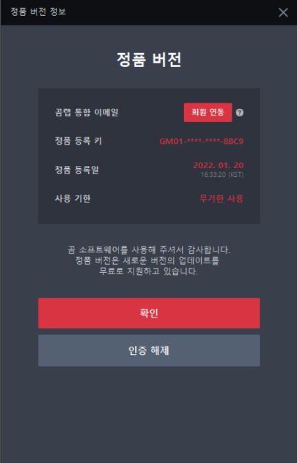 - 라이선스 인증이 해제되면 해당 라이선스 키 혹은 곰랩 로그인 계정을 사용하여다른 PC 에서 재등록 후 제품을 사용할 수 있습니다.