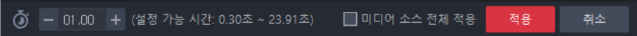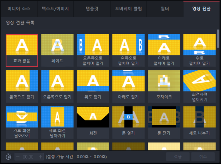): 영상 전환 효과가 지속되는 시간을 설정합니다. - 미디어 소스 전체 적용: 모든 미디어 소스에 영상 전환 효과가 적용됩니다.