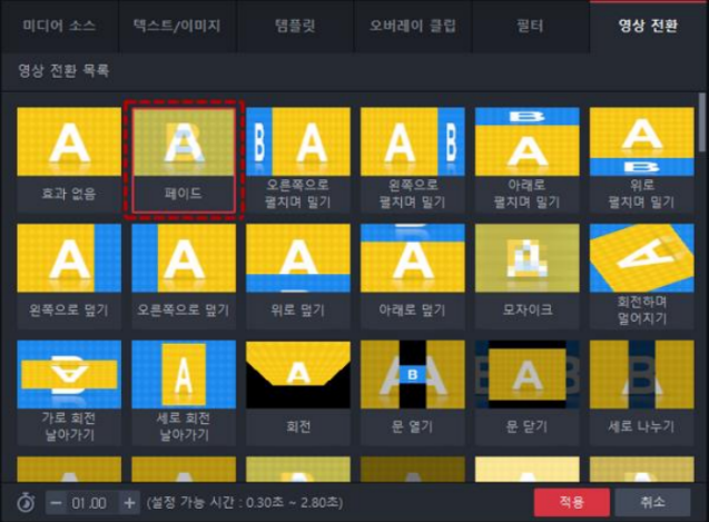 영상 전환 목록에서 적용하고자 하는 영상 전환 효과를 선택하세요.