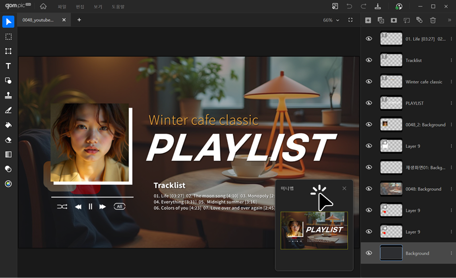 미니맵은 현재 작업 중인 프로젝트의 축소 미리보기로, 현재 보고있는 화면의 위치와 범위를 한 눈에 확인하고 빠르게 이동할 수 있도록 도와주는 도구입니다.