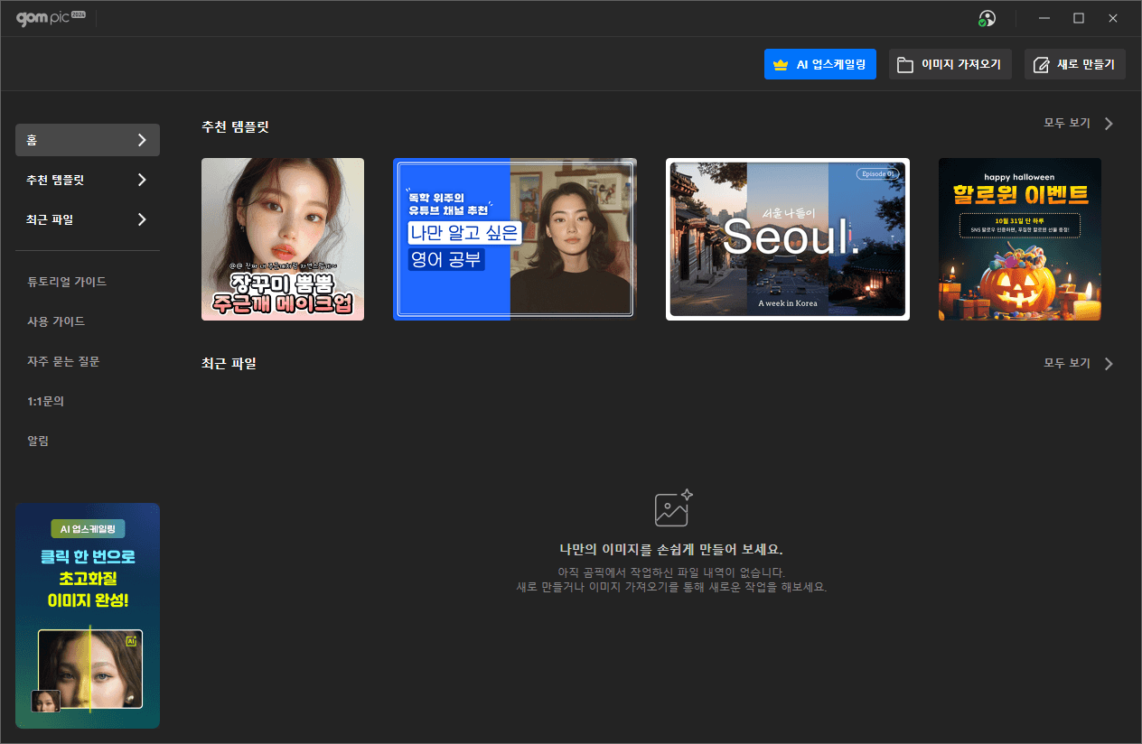원하는 템플릿을 선택하거나 이미지 화질 개선을 위해 AI 업스케일링으로 이미지를 불러올 수도 있습니다.