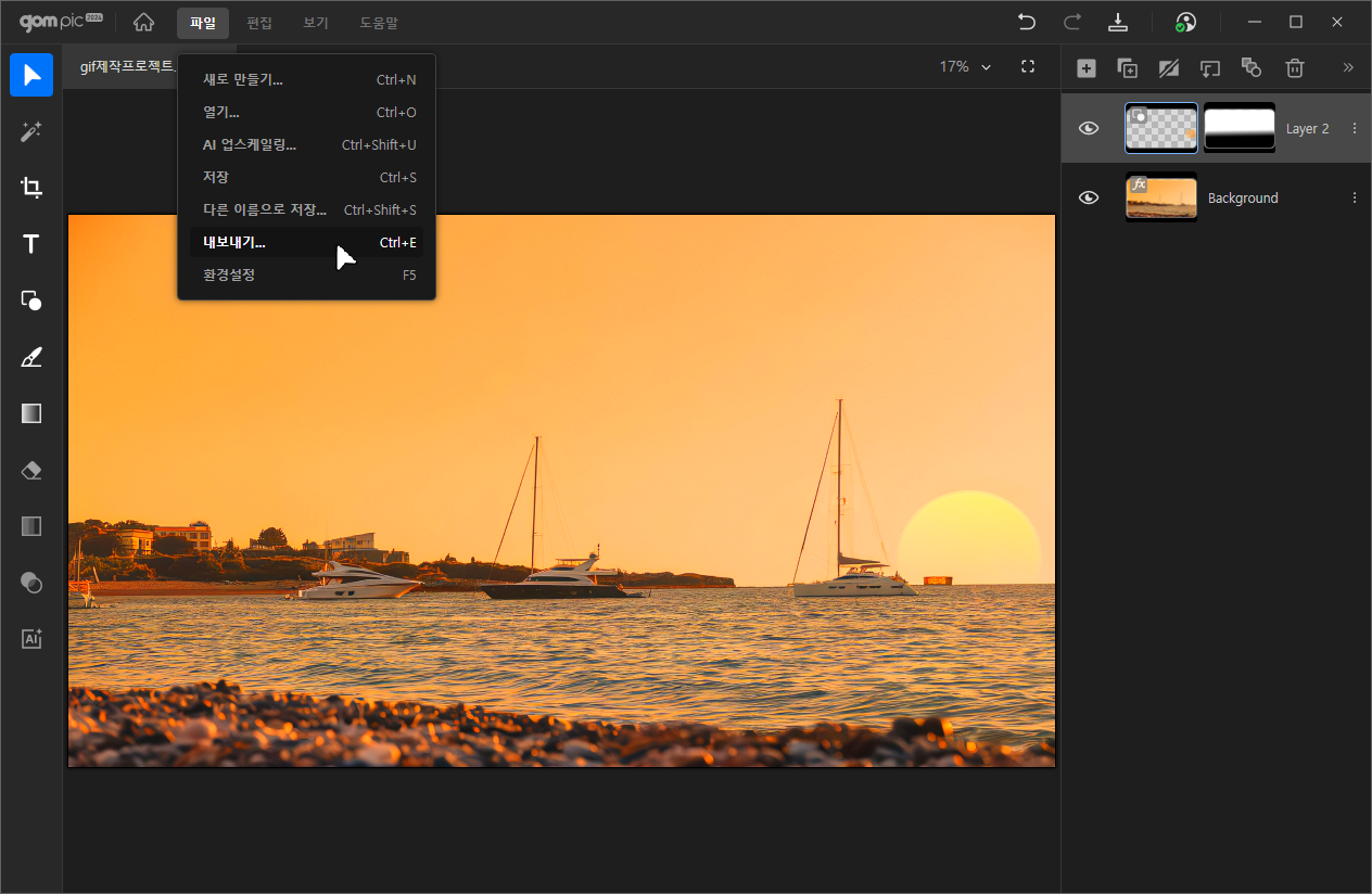 버튼 혹은 ’파일 > 내보내기‘를 클릭하거나, 단축키 Ctrl+E를 눌러 파일을 내보내기 합니다.