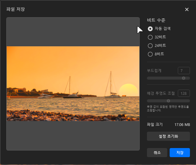 저장 옵션 창에서 품질 및 설정 값을 조정하고, [저장] 버튼을 클릭하여 파일을 최종 출력합니다.