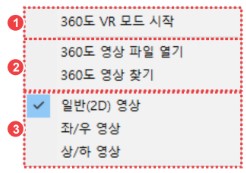 | 360도 VR 모드 시작 | VR 모드를 시작합니다. VR 모드를 시작하면 360도 VR 모드 정지 메뉴로 변경되며, 다시 선택하면 VR 모드가 정지됩니다. |