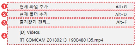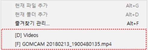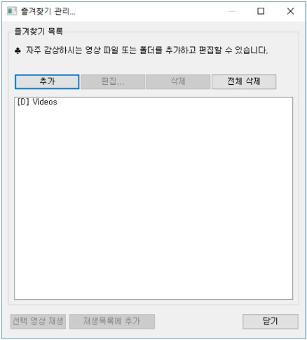 - 추가: 영상 파일이나 영상 파일이 저장되어 있는 폴더를 즐겨찾기 목록에 추가합니다.